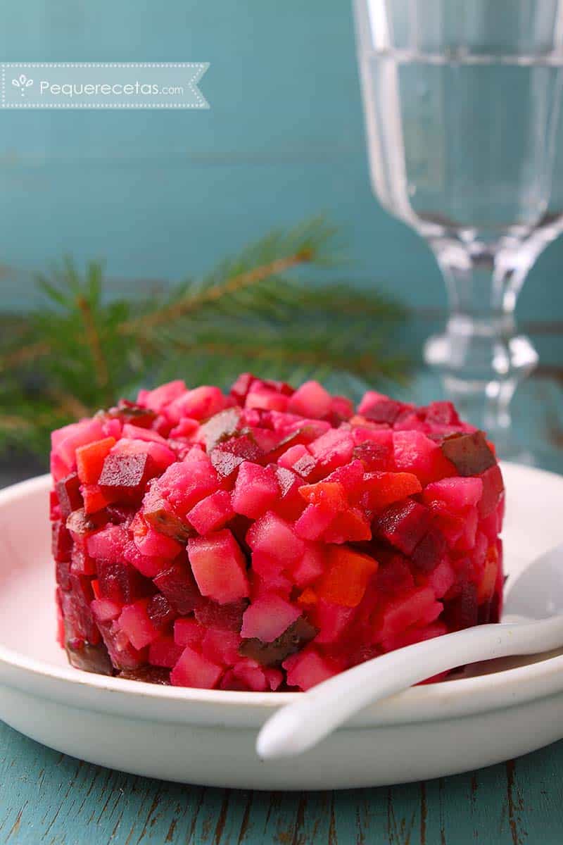 La ensalada Vinegret es un ingrediente esencial para cualquier fiesta en Rusia, especialmente la celebración del Año Nuevo. aunque hay muchas versiones de esta famosa ensalada de origen ruso los ingredientes esenciales siguen siendo remolacha, zanahorias, patatas, zumo de limón y aceite. Curiosamente no lleva vinagre entre sus ingredientes a pesar de su nombre. Podemos tomarla templada o fría y te invitamos a probarla porque realmente está deliciosa y su color rojo sin duda vestirá nuestra mesa navideña. Te recomendamos usar un aro de emplatar para la presentación (puedes comprarlo aquí).