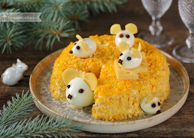 También podemos decorar la ensaladilla cubriéndola con yema de huevo cocida y rallada, o un queso rallado bien amarillo. Luego con unos huevos cocidos hacemos los ratoncitos, con colitas y orejas recortadas en una loncha de queso y ojos y nariz de clavo de olor.