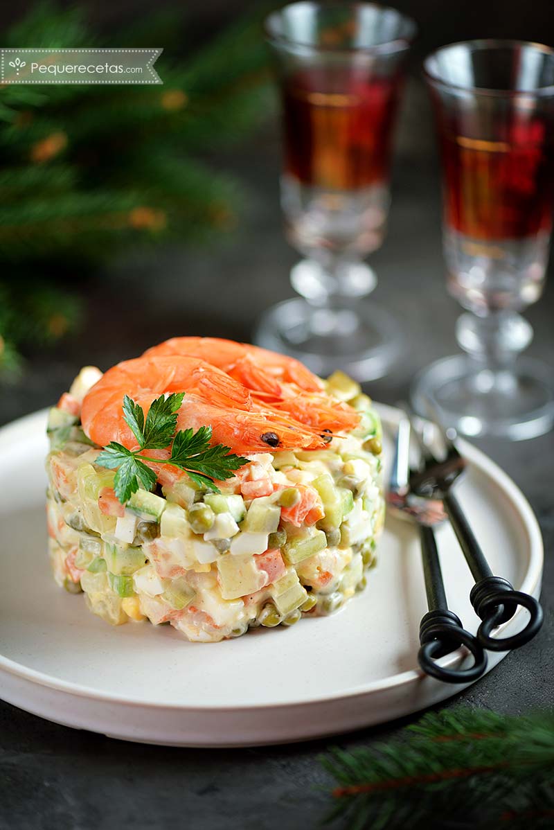La ensaladilla de gambas es una ensalada navideña tradicional, tan solo tenemos que vestirla de fiesta usando un anillo para emplatar (puedes comprarlo aquí) para servirla, y decorando con unos langostinos (ver cómo cocer langostinos).
