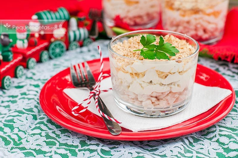 Tal como te venimos diciendo presentar una ensalada de Navidad elegante y original a veces es una cuestión más de presentación. ¿Puede una ensaladilla rusa ser original? Os proponemos esta presentación en capas, donde hemos alternado los ingredientes: patatas cocidas con mayonesa, atún, maíz, zanahoria, mayonesa y huevo cocido rallado.