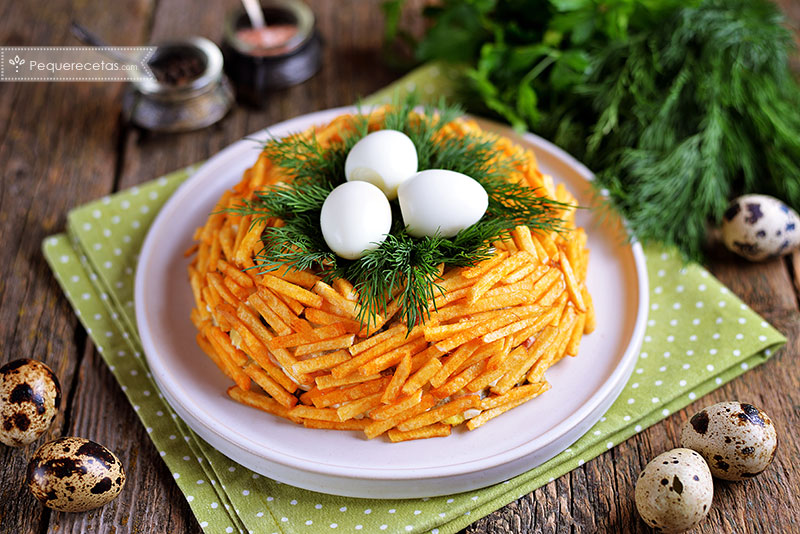 Otra ensalada tradicional rusa es esta ensalada Nido de Urogallo, que se llama así porque era tradicional la caza de este ave, que estaba entre sus ingredientes. A la ensalada se le daba la forma del nido del urogallo elaborado con patatas fritas. Posteriormente este ave fue sustituida por pollo ya que está en peligro de extinción, pero la ensalada sigue teniendo la misma esencia y estñando igual de rica. A los peques les encantará la idea seguro.