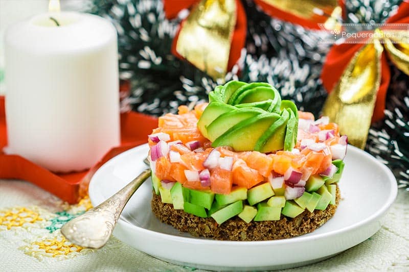 Cortamos el aguacate grande en dados y lo aliñamos con zumo de limón, sal y pimienta. Con un anillo de emplatar (puedes comprarlo aquí) cortamos círculos de pan y lo tostamos un poquito en la plancha o el horno. Colocamos el anillo de emplatar en el plato, disponemos el pan por debajo, luego una capa de aguacate, una de salmón, con un cuchara presionamos delicadamente y retiramos el anillo. Decoramos con una flor de aguacate que haremos con los dos aguacates pequeños, en este vídeo podéis ver cómo se hace: