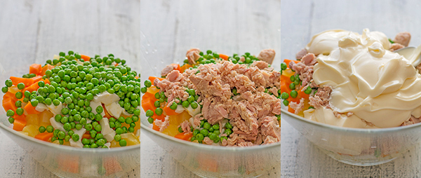 - Incorporamos los guisantes, el atún bien escurrido y la mayonesa.