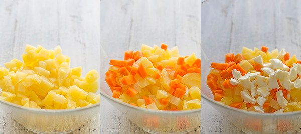 - En una fuente grande añadimos las patatas y las zanahorias cortadas en dados.