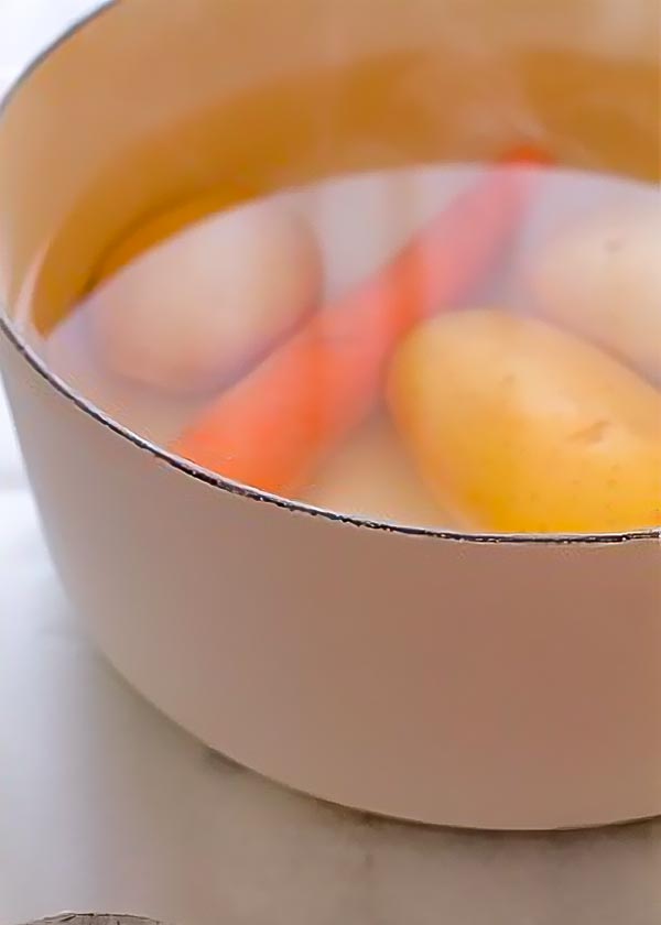 - Al mismo tiempo en otra cazuela ponemos a hervir agua con dos cucharaditas de sal; añadimos las patatas enteras y con cáscara, junto con la zanahoria, entera y pelada.
