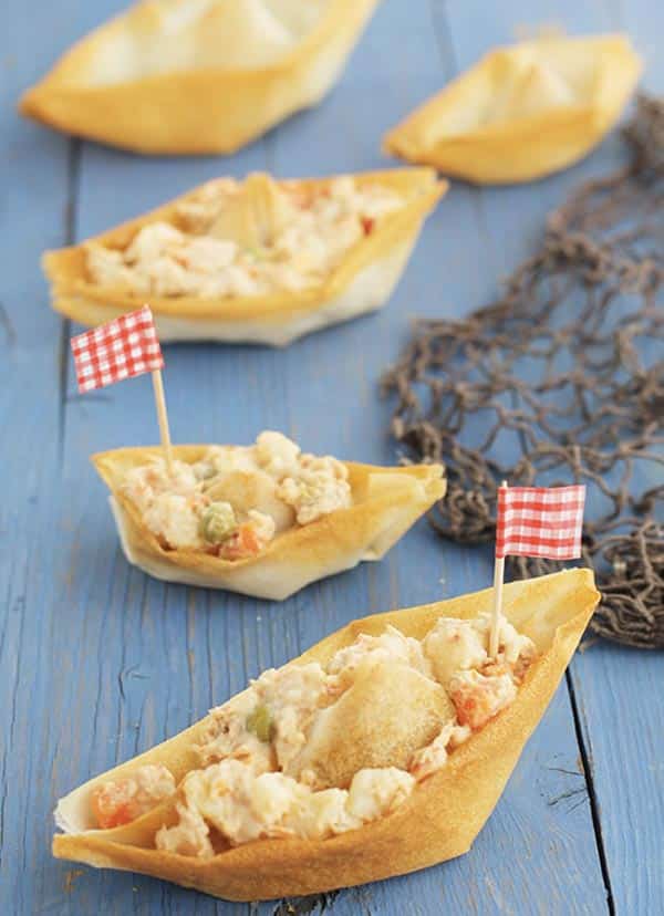 Para hacer estos originales aperitivos tan solo tenéis que comprar pasta brick en el supermercado y cortar cuadrados. luego vais doblándolo siguiendo estos pasos para hacer un barco de papel. Lo único que he hecho, ha sido poner en las esquinas palillos porque se abrían y me daba miedo que en el horno se separaran mucho. Una vez que tengáis formado el barco, le dais la vuelta y en el hueco de dentro ponéis una bola de papel de horno, de esta forma nos aseguramos de que quede perfecto.