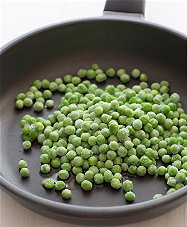 - En otra cazuela o sartén, añadimos una cucharadita de aceite de oliva virgen extra y cocinamos los guisantes con un poquito de sal un par de minutos hasta que están tiernos.