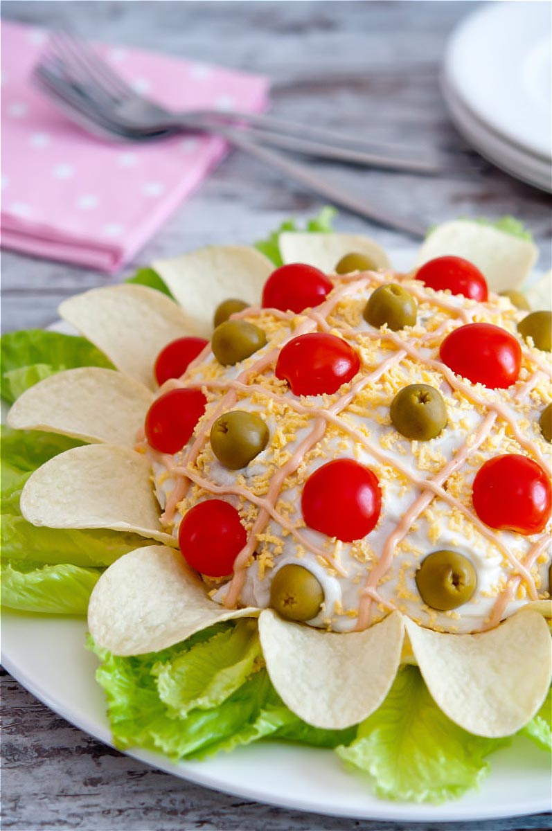 - Luego solo tienes que rodear la ensaladilla con patatas fritas para simular los pétalos.
