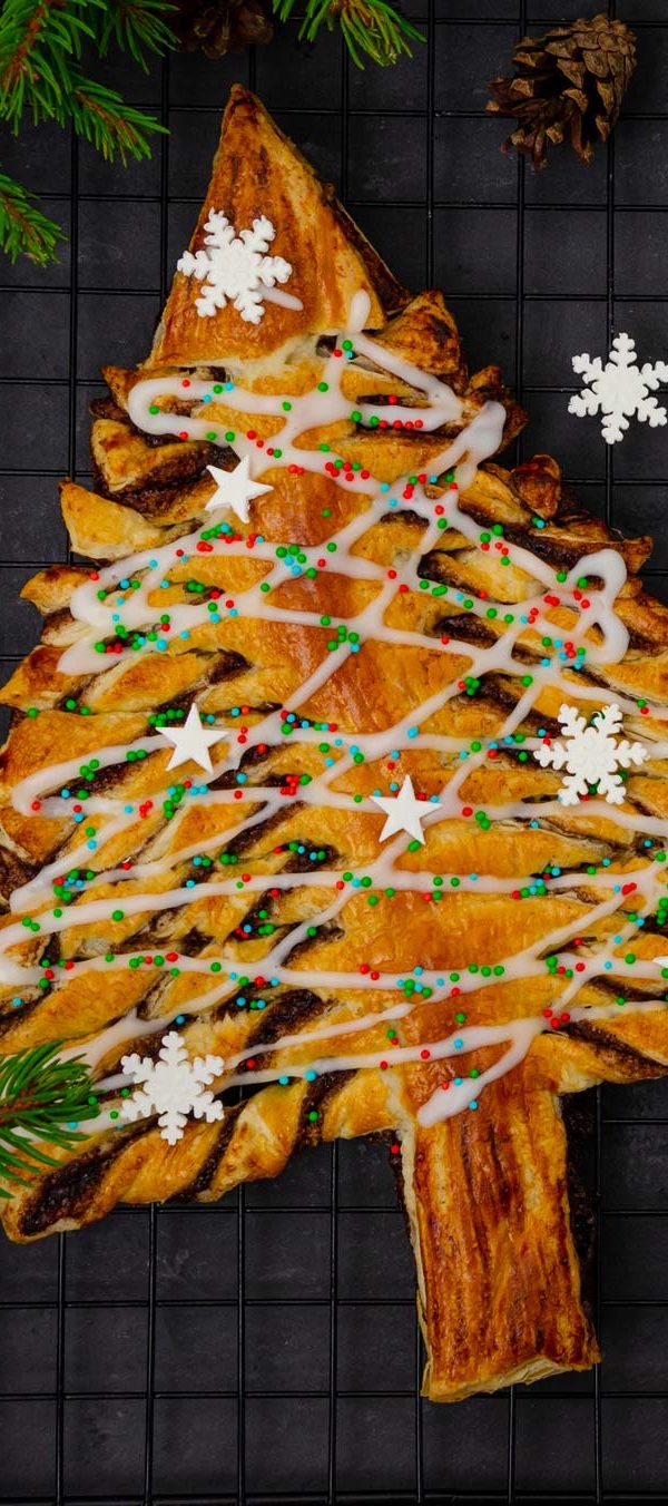 Mira qué original este árbol de Navidad de hojaldre, que puedes rellenar como una pizza, con tomate, queso y tu relleno favorito. Si en tu mesa navideña va a haber niños esta idea les fascinará. Para hacerlo solo tienes que extender una lámina de hojaldre rectangular, extender tu relleno y poner encima otra lámina de hojaldre igual. Luego corta con la forma de un árbol, haz cortes horizontales y enróllalos. Pinta con huevo batido y hornea hasta que esté dorado.