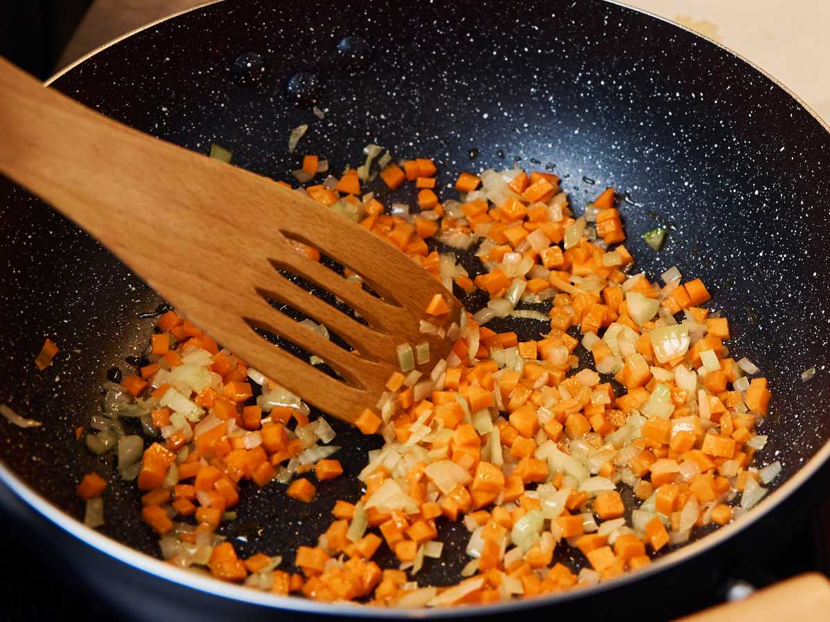 - Ponemos en una cazuela aceite de oliva virgen extra y añadimos la zanahoria, el apio y la cebolla picados finamente con un poco de sal y sofreímos.