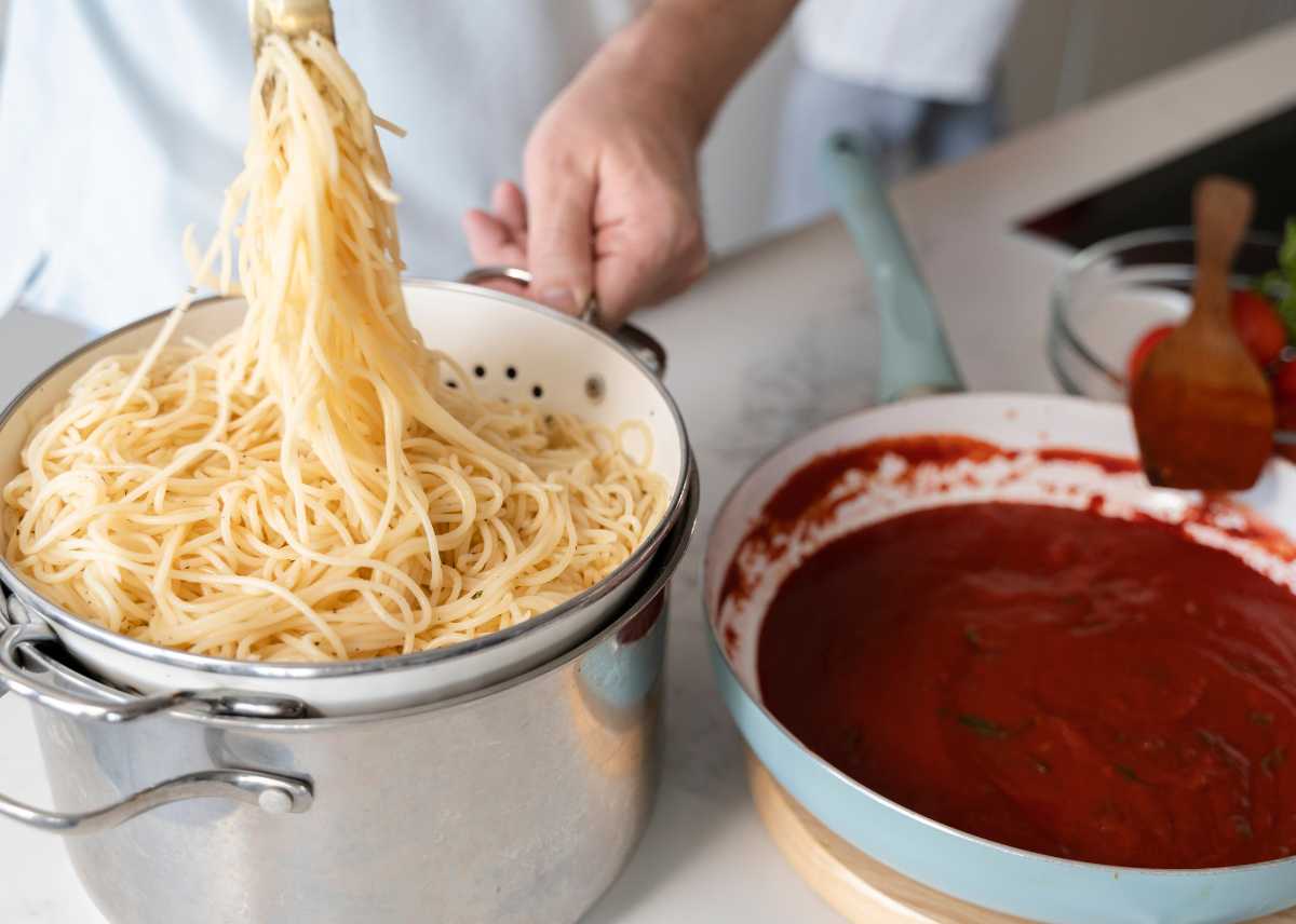 - Una vez que los espaguetis estén cocidos, escúrrelos y añádelos a la sartén con la salsa de tomate.
