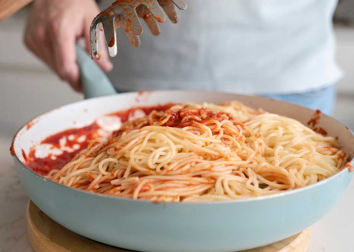 - Mezcla bien para que los espaguetis queden bien cubiertos con la salsa.
