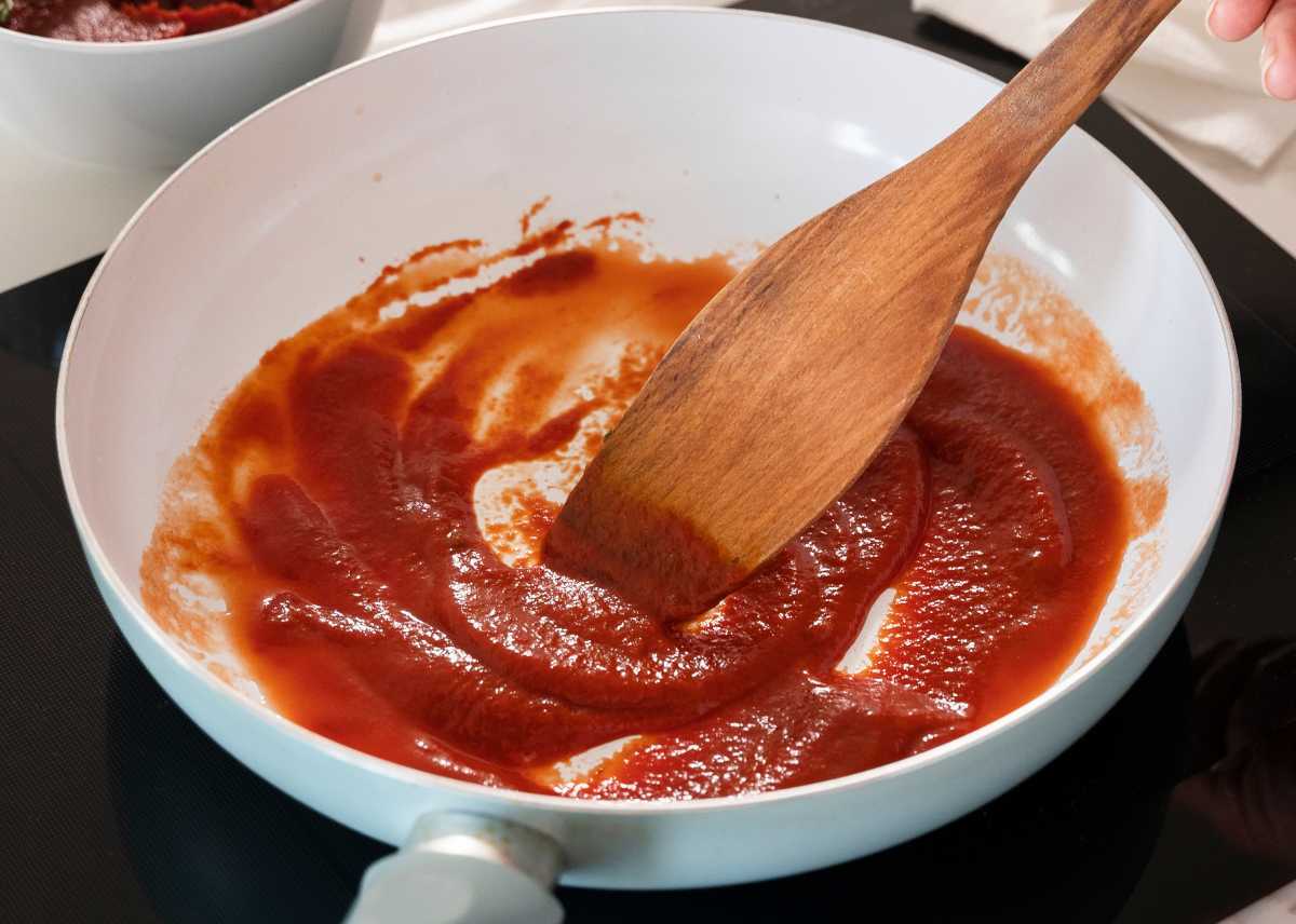 - Agrega el tomate triturado a la sartén y cocina a fuego medio-bajo durante unos 10-15 minutos, hasta que quede una salsa espesa.
