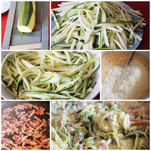 La idea es cortar los calabacines en tiras muy finas, como si fueran espaguetis y los vamos a cocinar como si de unos auténticos espaguetis a la carbonara se tratase. A mí me gusta dejar un poco de piel a los calabacines al espiralizarlos, porque le dan algo de color al plato, pero si vuestros peques son de los que no quieren nada verde en el plato, podéis quitarles toda la piel.