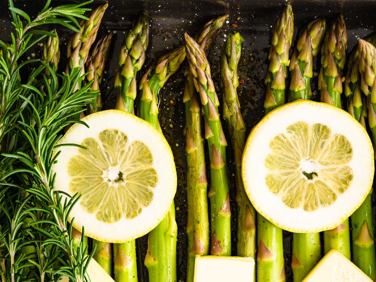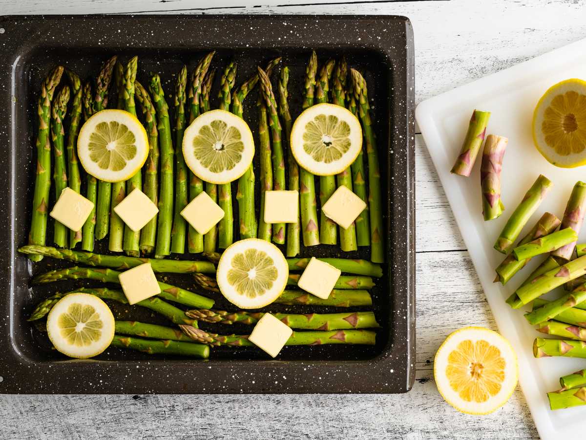- Corta el limón en rodajas finas y colócalas sobre los espárragos.