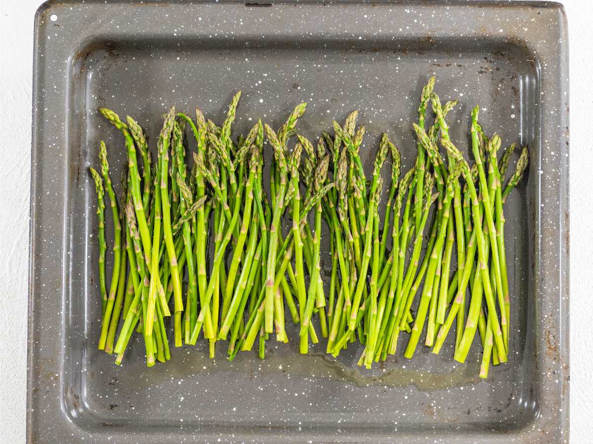 - Coloca los espárragos en una bandeja para hornear y rocíalos con un poco de aceite de oliva.