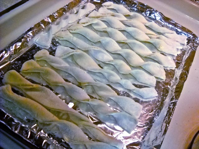 - Colocar los palitos retorcidos en una bandeja de hornear cubierta de aluminio. Hornee a 200ºC durante 8-10 minutos o hasta que estén bien dorados.