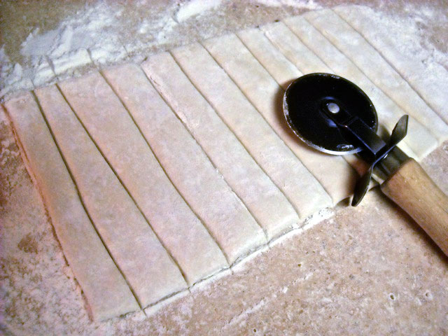 - Doblar la hoja por la mitad para encerrar el relleno. Usando un cortador de pizza o un cuchillo afilado, cortar la masa de hojaldre doblada en tiras.