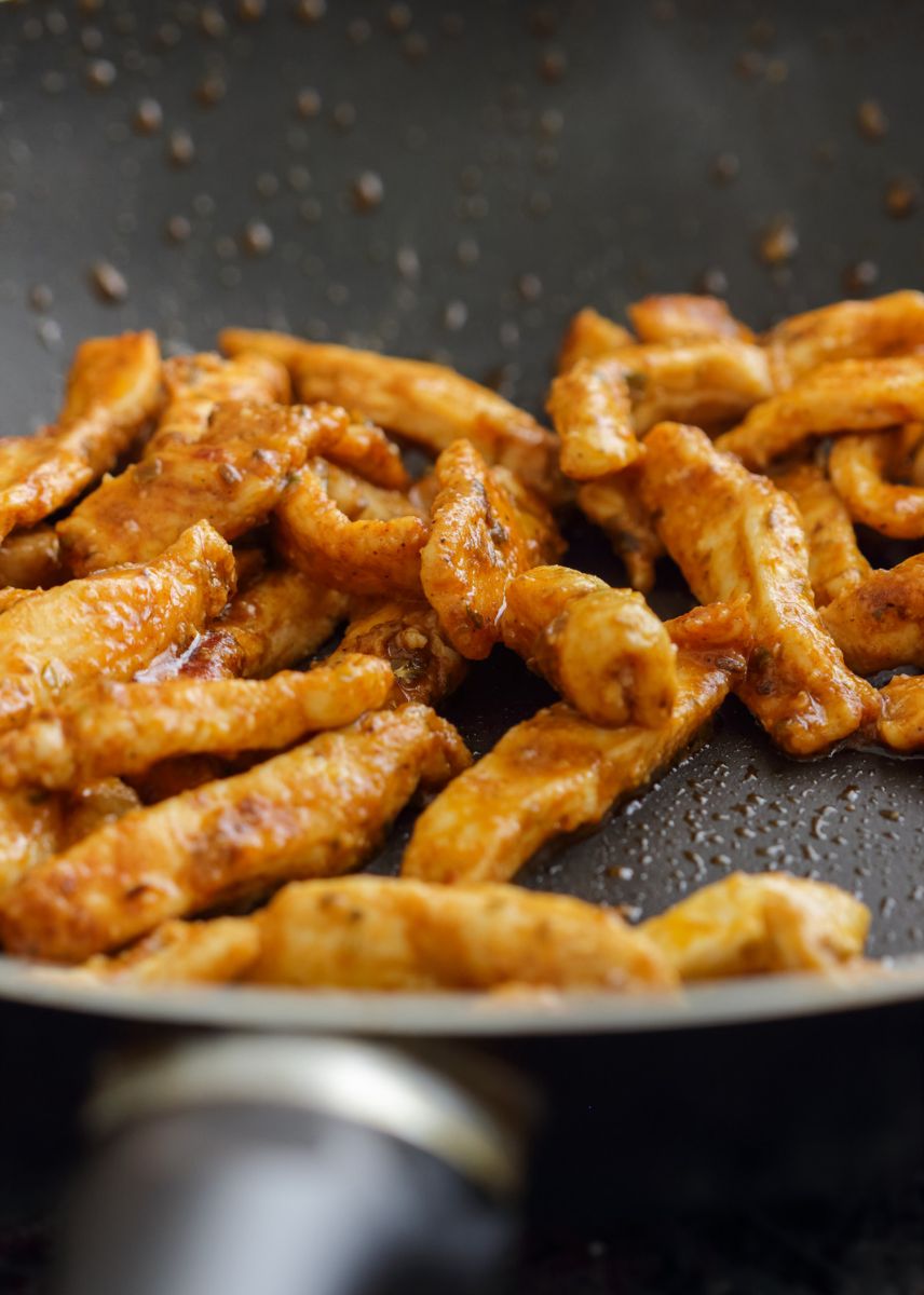 • Retira las tiras de pollo del marinado y cocínalas en una sartén caliente hasta que estén doradas y cocinadas por completo.