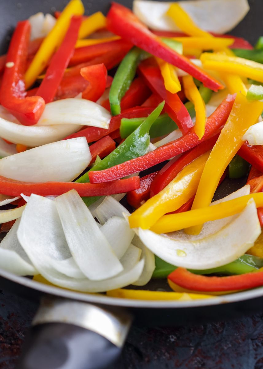 • Agrega las tiras de pimientos y cebolla a la sartén y saltea a fuego medio-alto hasta que estén tiernos pero aún crujientes.