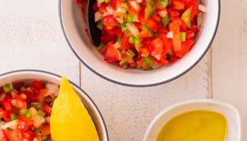 Ingredientes: 1 tomate, 1 pequeño pimiento verde, 1 pequeño pimiento rojo, 1 cebolla, 1/2 manojo de cilantro (o sustituir por perejil), 2 cucharaditas de limón, 1 chile jalapeño o serrano en conserva, 3 cucharaditas de aceite de oliva virgen extra, sal.