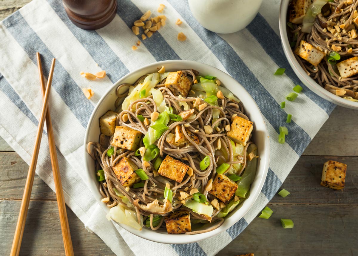 Escurre bien el tofu, lo prensas entre dos hojas de papel absorbente para eliminar bien el líquido, lo cortas en cubos, lo salteas en el wok o en una sartén grande con poquito aceite y reservas. Cuando tienes listos los soba en el wok con las verduras, incorporas el tofu y remueves antes de servir.