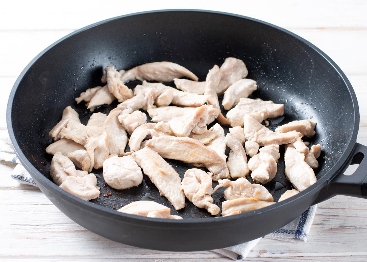 - Limpiamos la pechuga de pollo y la cortamos en tiras.