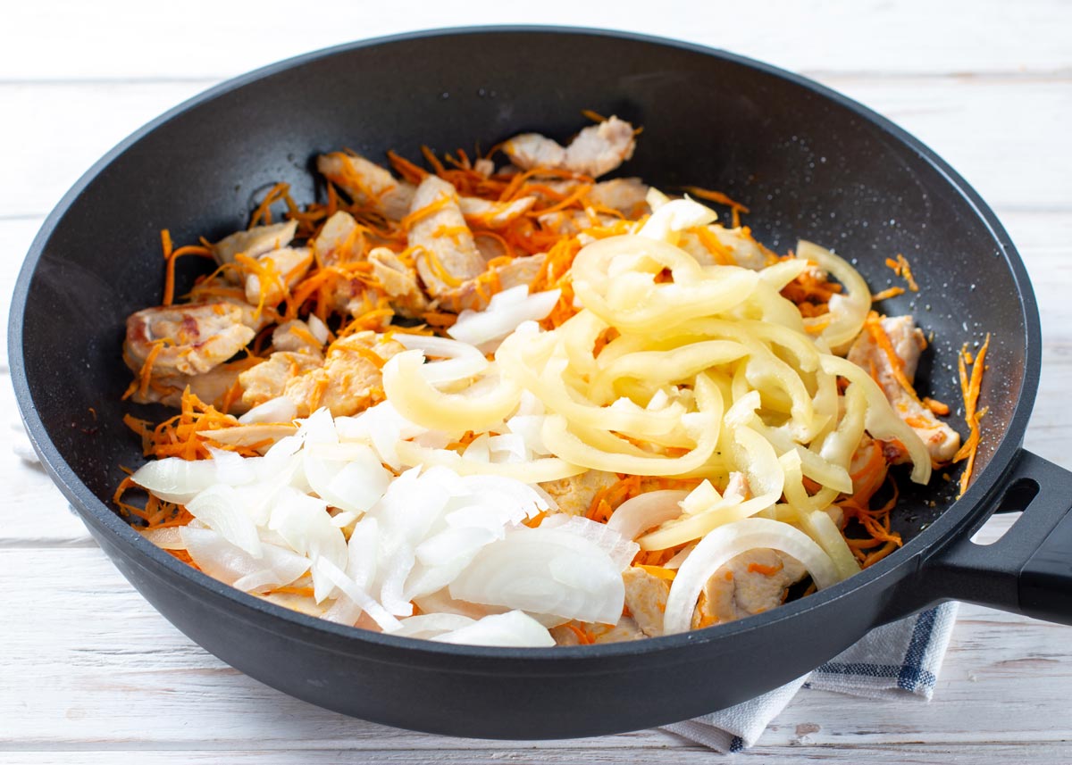 Como decíamos, se pueden utilizar otras carnes troceadas, en particular cerdo o pavo, como en esta receta que os proponemos donde hemos salteado pavo en tiras, zanahoria en juliana, judías verdes, guisantes, pimiento picante fresco (el que quieras) y maíz baby.