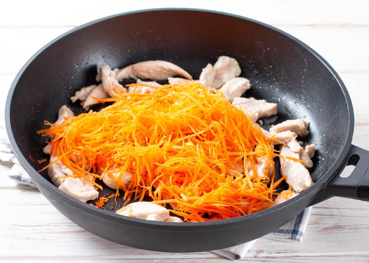 - Añadimos las zanahorias ralladas y el ajo picado y removemos, cocinando unos 3-4 minutos.