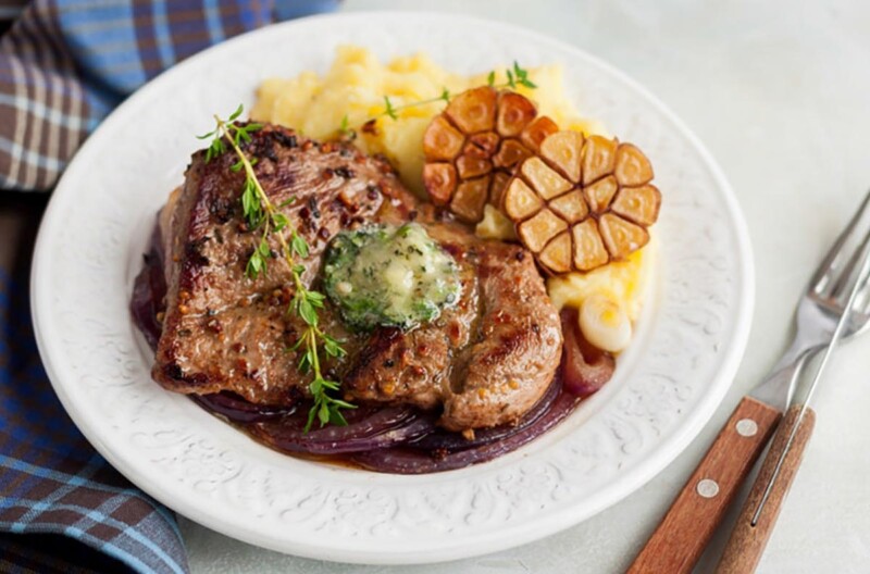 - Cuando los filetes estén listos, colócalos en un plato con la salsa del marinado, y añade una rodaja de la mantequilla de hierbas por encima.