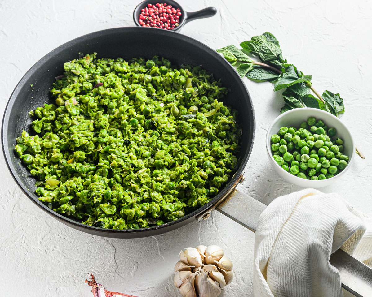 - Escurrimos los guisantes y los machacamos con un pisapatatas o un tenedor para hacer un puré.