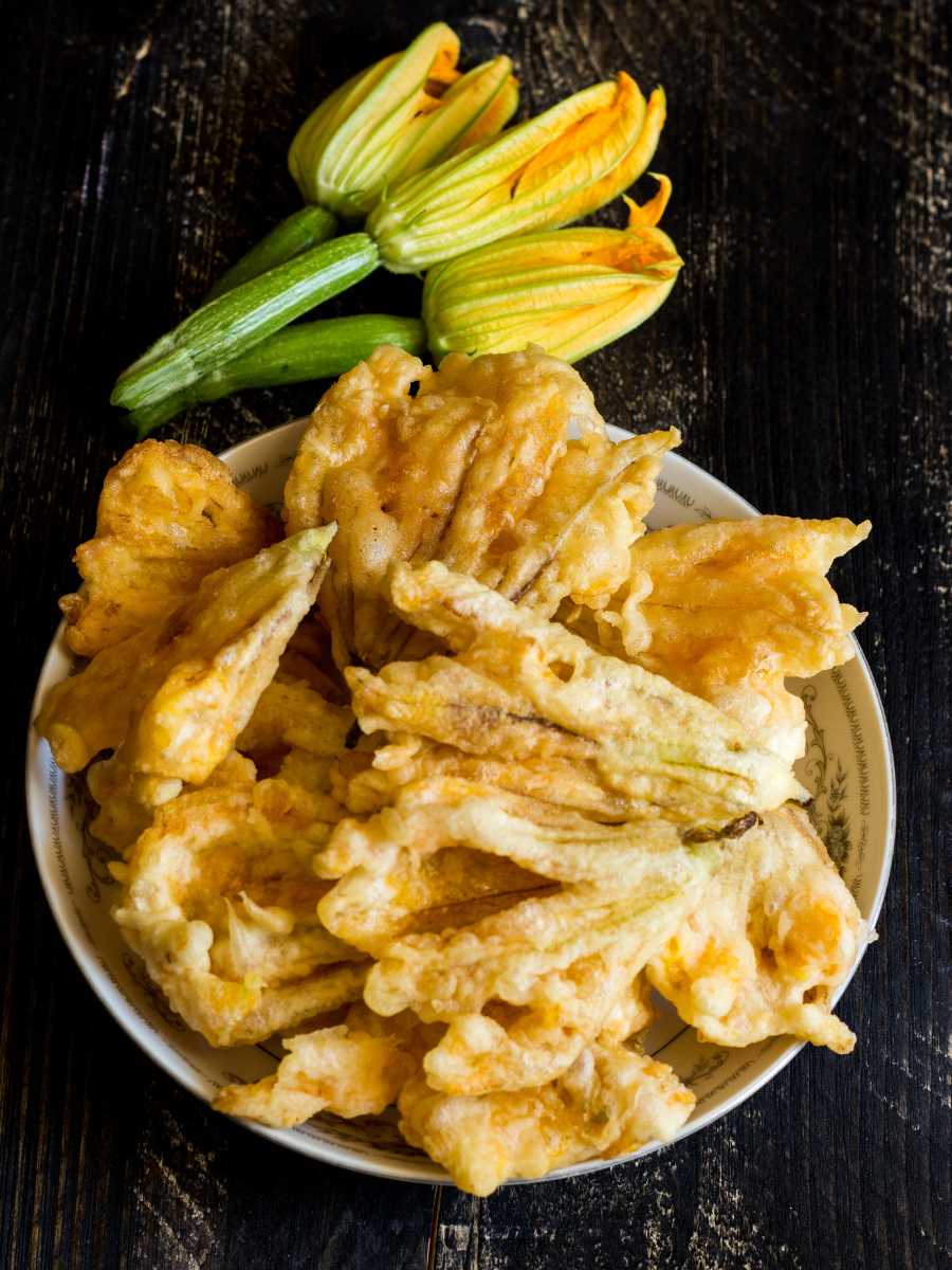 - Fritura de las flores: Una vez que las flores están limpias y la pasta de rebozado está lista, se sumergen las flores en la pasta y se fríen en aceite caliente hasta que estén doradas y crujientes.