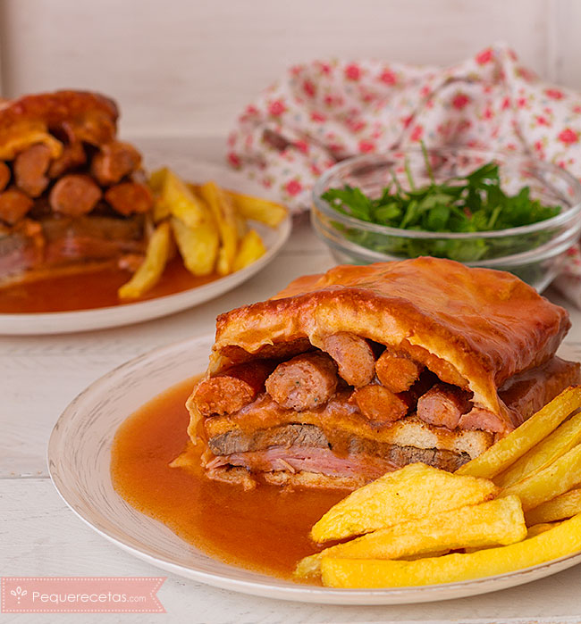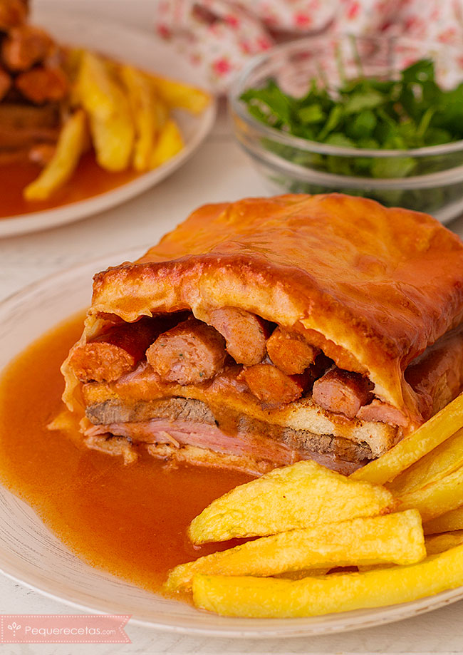 Para presentar la francesinha vertemos la salsa que teníamos reservada, bien caliente y en abundancia por encima, y acompañamos de unas patatas fritas.