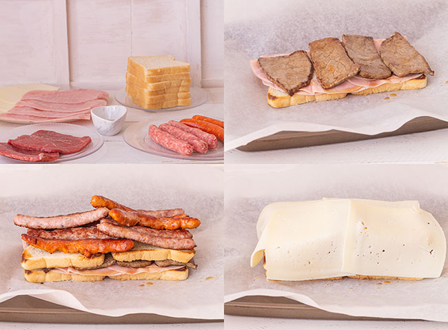 - Colocamos en una fuente dos rebanadas de pan encima repartir el jamón de York y los filetes tapamos con otras dos rebanadas de pan y repartimos los chorizos y salchichas