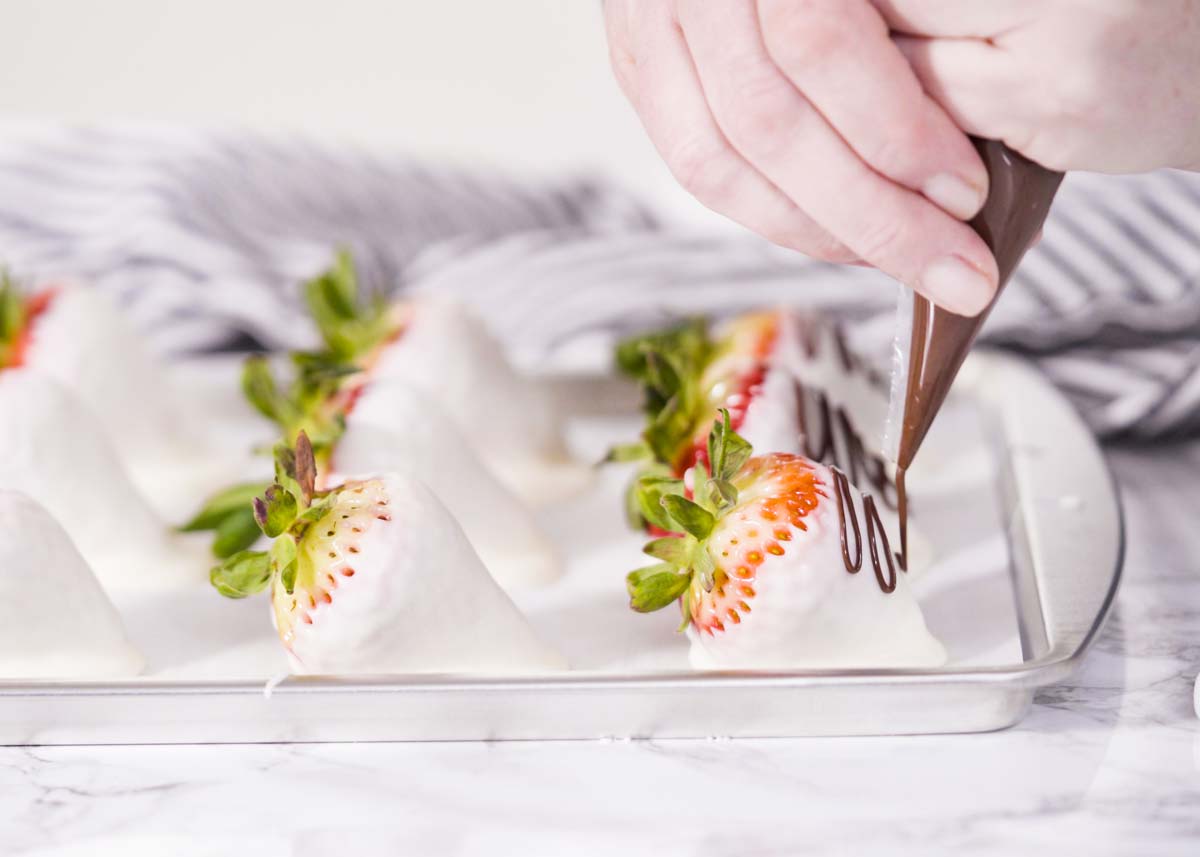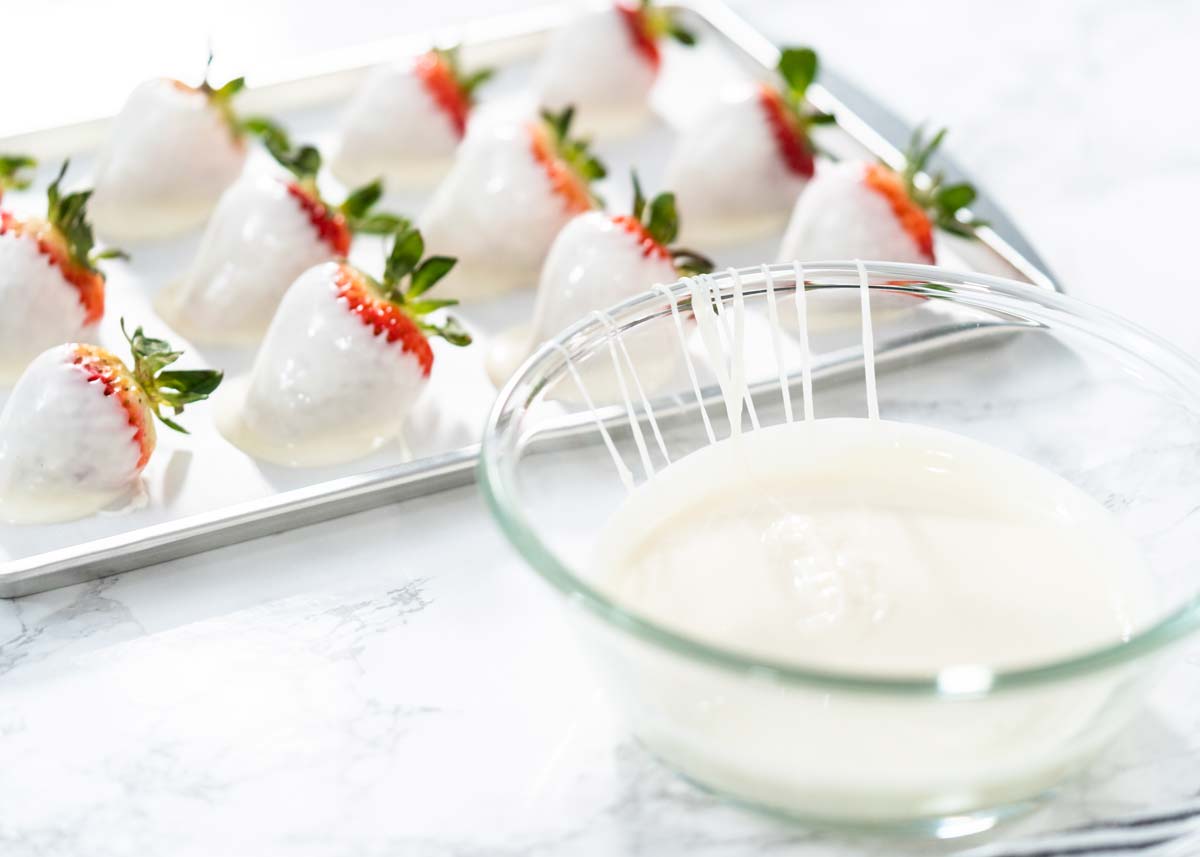 - Derretimos los Candy Melt blancos (puedes comprar aquí) y bañamos las fresas, colocando luego sobre una bandeja con papel pergamino. Dejamos secar.