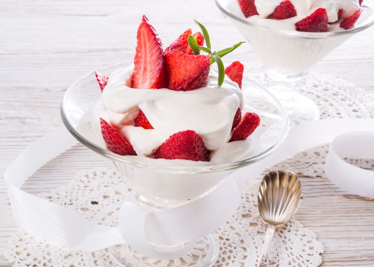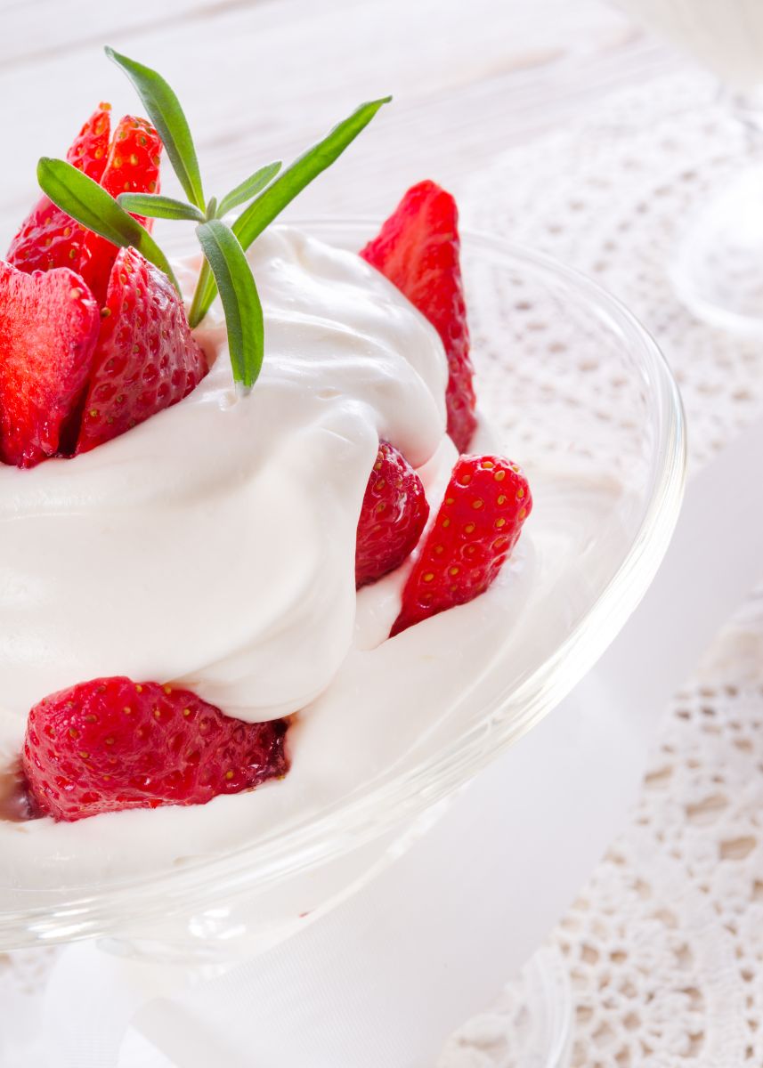 - Ponemos las fresas en copas o boles y con una manga pastelera echamos la nata montada por encima.