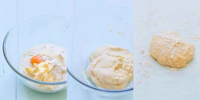 En un cuenco añadimos harina, sal, azúcar, mantequilla o margarina, leche y 1 yema. Con las manos vamos mezclando todo hasta conseguir una masa sin grumos y algo pegajosa.