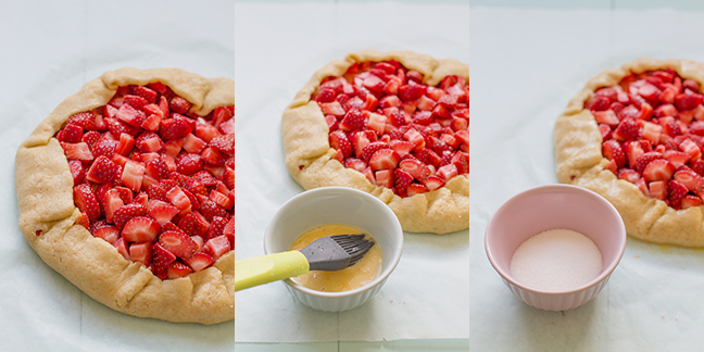 Subimos los bordes de la masa sobre las fresas y pintamos con huevo la masa. Luego, espolvoreamos con un poquito de azúcar.