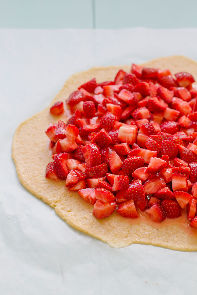 Disponemos las fresas sobre la masa que tenemos estirada, dejando los bordes de la masa sin rellenar.