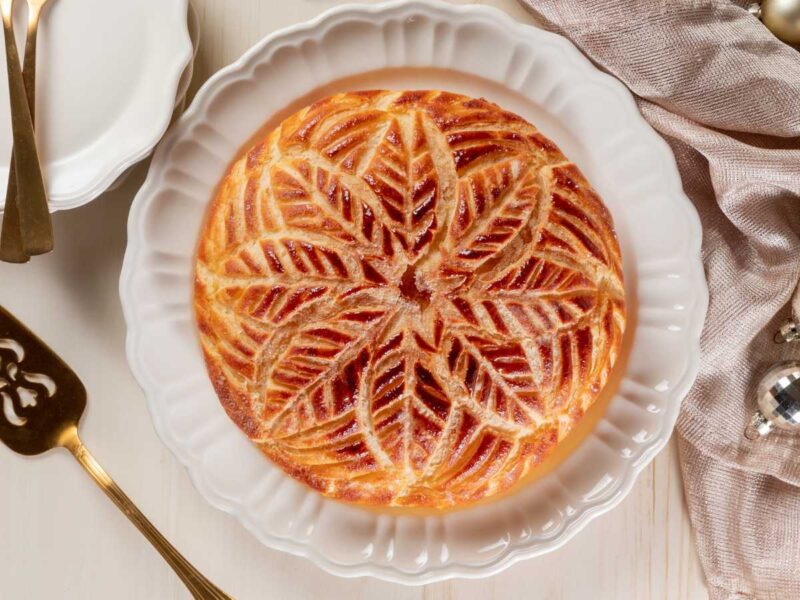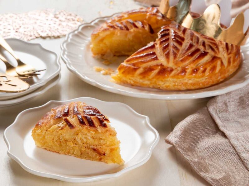 La Galette des Rois se caracteriza por una capa de hojaldre dorado que envuelve un relleno cremoso, generalmente de frangipane, una mezcla de crema de almendra y crema pastelera.
