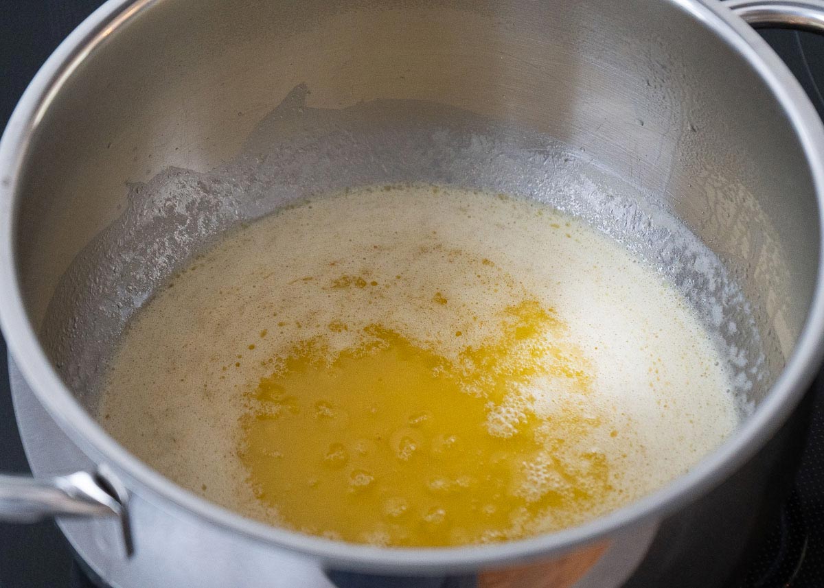 - Para hacer la mantequilla dorada, colócala en trozos en una pequeña cacerola y déjala derretir a fuego medio, revolviendo constantemente.