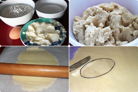 Como no tenía cortadores ovalados lo he hecho de forma casera, he dibujado en un papel acetato tres óvalos, de 10, 8 y 6 cm que he recortado. Ponemos sobre la masa estirada y con la ayuda de un cuchillo marcamos la forma y vamos cortando las galletas, haremos el mismo número de galletas en los tres tamaños. La masa restante la volvemos a unir y seguimos cortando hasta que terminemos toda la masa.