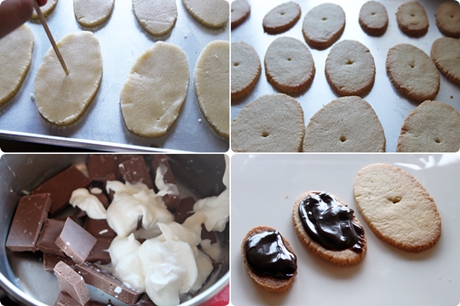 Disponemos las galletas en la bandeja de horno, en el centro agujereamos con la brocheta que luego vamos a utilizar, e introducimos en el horno precalentado, a 180º durante 10 o 12 minutos, en cuanto los bordes comiencen a dorarse las sacáis porque se endurecen al enfriarse.