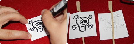 Ya sólo nos queda terminarlas, podéis hacer las banderas como más os guste, yo al principio las puse blancas con el dibujo en negro pero las vi un poco sosas así que al final recorte la silueta de la cartulina blanca y la pegue en la negra. Si tenéis rotulador blanco sólo tendréis que pintar sobre la negra. Unimos con un poco de papel celo a la brocheta y clavamos uniendo las tres galletas