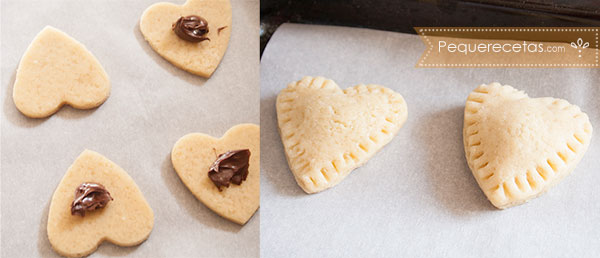 - Ponemos un poquito de Nocilla o similar en el centro de cada galleta, colocamos otra galleta encima y cerramos los bordes haciendo un poco de presión con un tenedor.
