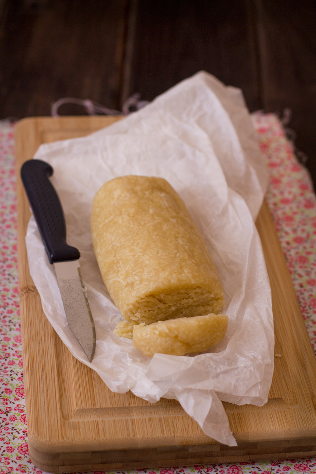 - Formamos un rollo y lo envolvemos con papel film, llevamos a la nevera por dos horas hasta que enfríe bien la masa.