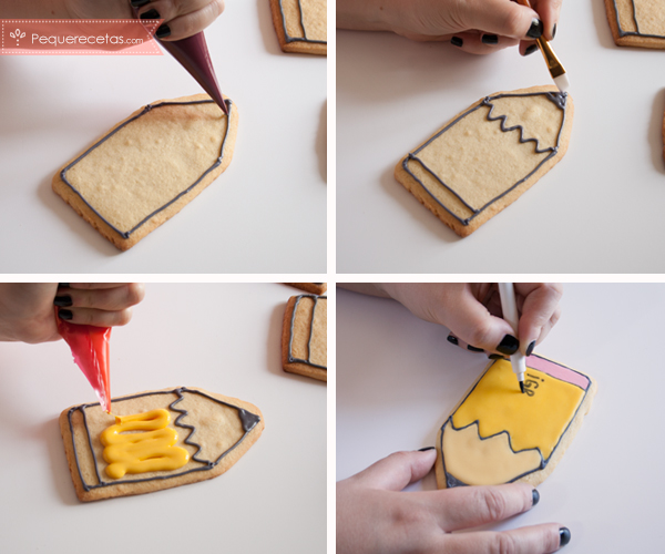 Una vez que tenemos listo el glaseado, lo teñimos con colorantes alimentarios en gel o en polvo, hasta obtener los colores deseados. Rellenamos mangas de pastelero desechables con cada color, y con unas tijeras cortamos las puntas. La del color negro de delineado debe ser pequeñita, las otras más grandes. Delineamos el contorno del lápiz, sin apoyar la punta de la manga sobre la galleta y con un movimiento rápido, para que la línea nos quede lo más derecha posible. Si nos han quedado piquitos o irregularidades los arreglamos con un pincel humedecido en agua. Dejamos secar (depende de la densidad de vuestro glaseado, aprox. 30 minutos).