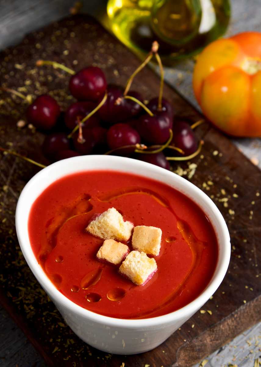 La combinación de las cerezas y el tomate, ricos en antioxidantes y vitaminas, y el pepino con su poder depurativo, convierten a esta receta de gazpacho de cerezas en un aliado para tu salud.
