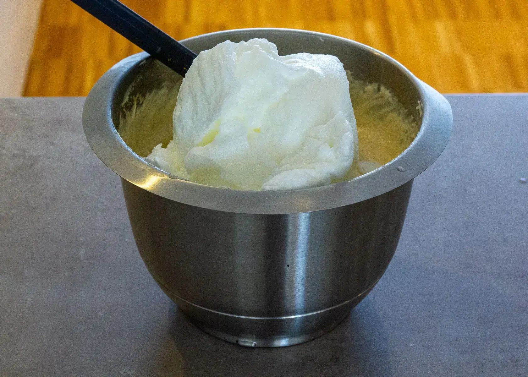 - Por último, con movimientos envolventes para no bajar el volumen, incorporar las 2 claras montadas a punto de nieve firme.