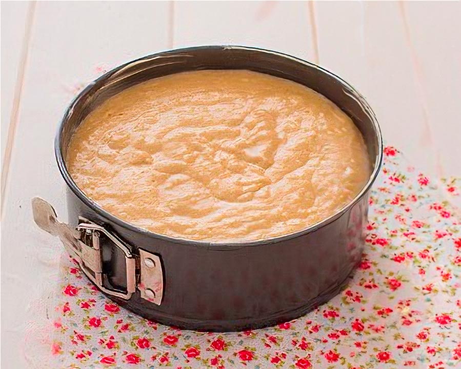 - Una vez la harina esté completamente integrada, vertemos la masa en un molde, que puede ser redondo de aproximadamente 28 cm de diámetro o rectangular de unos 25 x 35 cm. Es importante que el molde esté previamente forrado con papel para hornear y que sea lo suficientemente grande para que el bizcocho no quede demasiado fino.